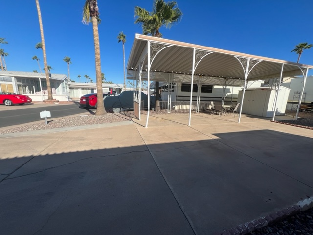 Full concrete pad will accommodate a 40 ft motor home or trailer. Renter to verify their slides will fit. Awning with table, 4 chairs and 2 storage sheds. Lighted patio. Includes, water, sewer, trash and basic cable [Directv] (requires access to wi-fi). Friendly community with 2 pools, 4 jacuzzis, pickleball, tennis, bocce, gym, community center and more. Pets welcome per VO guidelines. 55+ Community. Higley and Main.