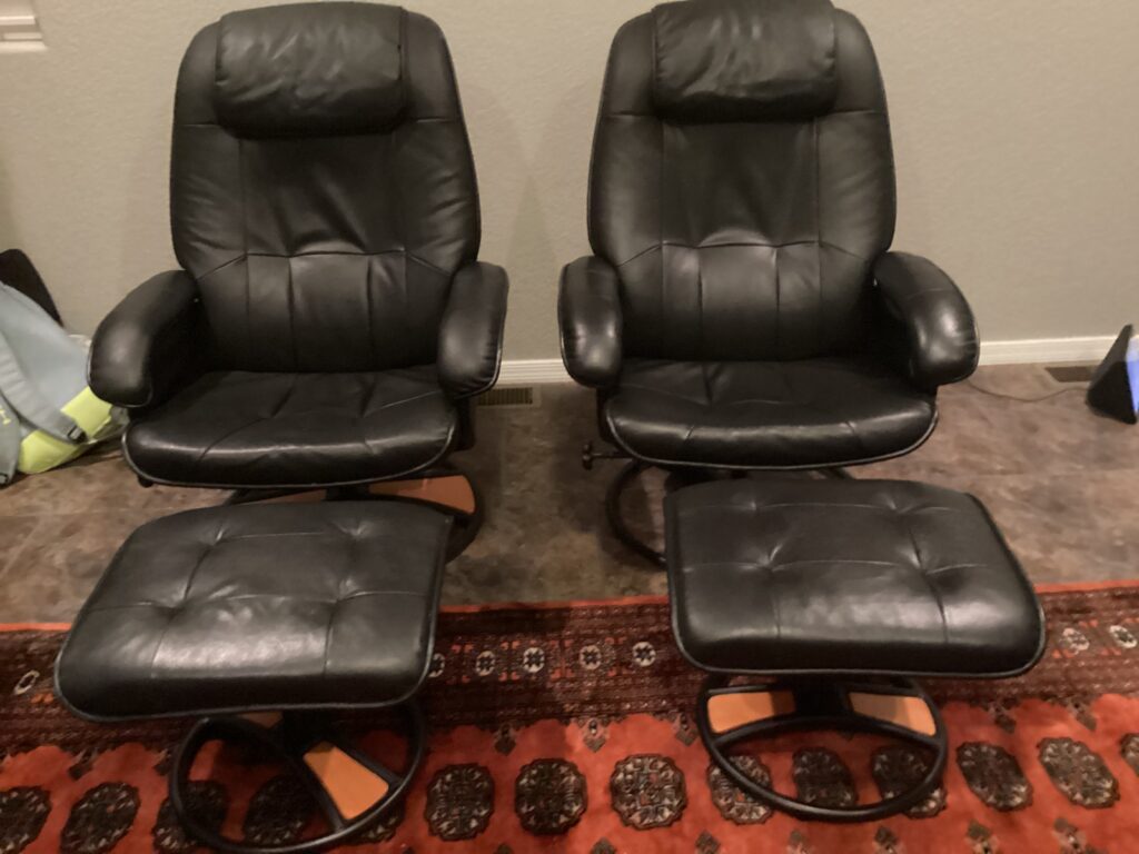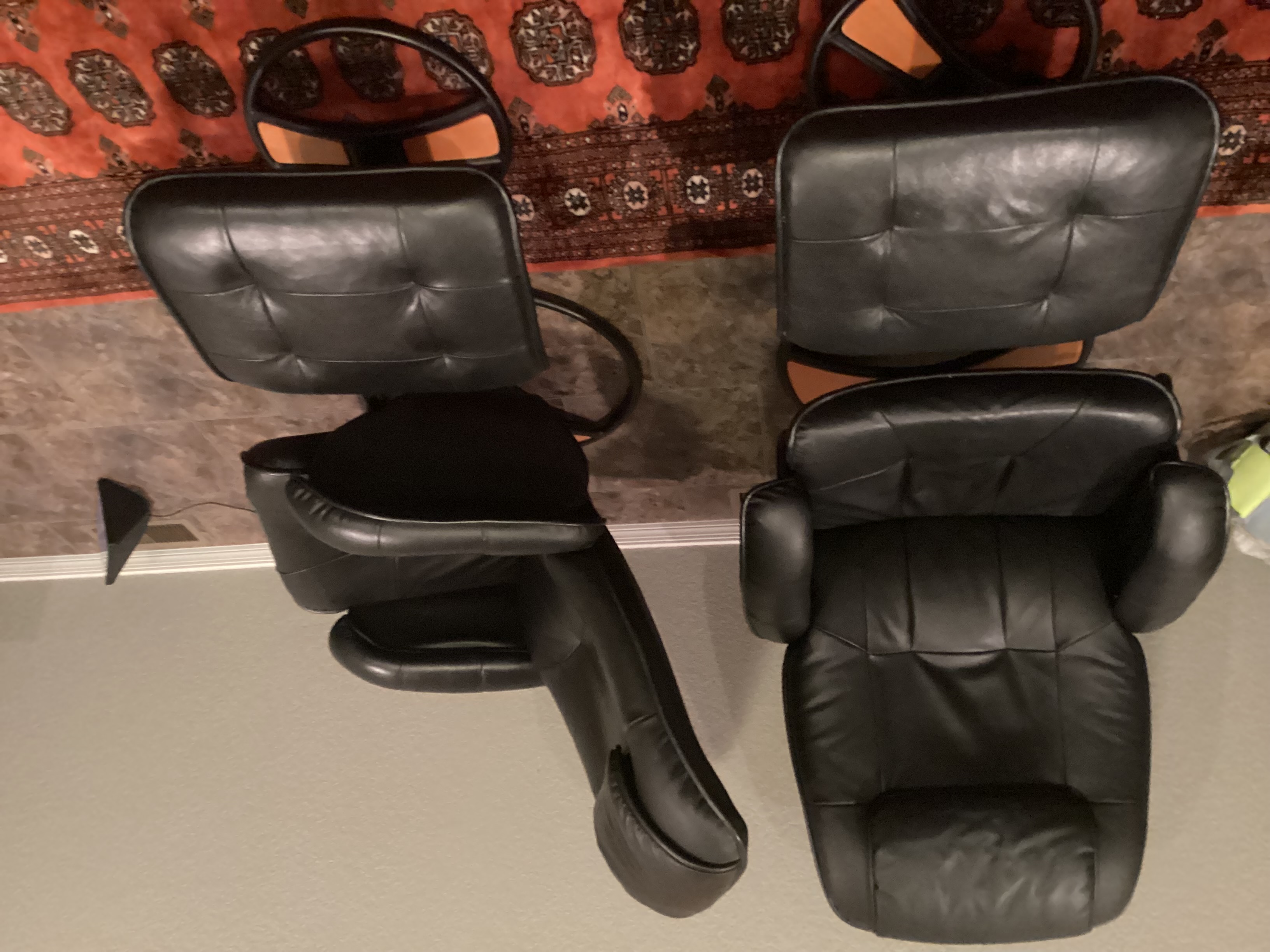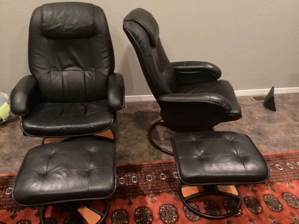 2 black leather reclining/swivel chairs with matching ottomans, in good condition, for sale by original owners who purchased these new at Copenhagen Imports in Tempe. Selling both sets for $300.00. Phone 780-913-5705 or email lloydgreta@gmail.com to arrange viewing.