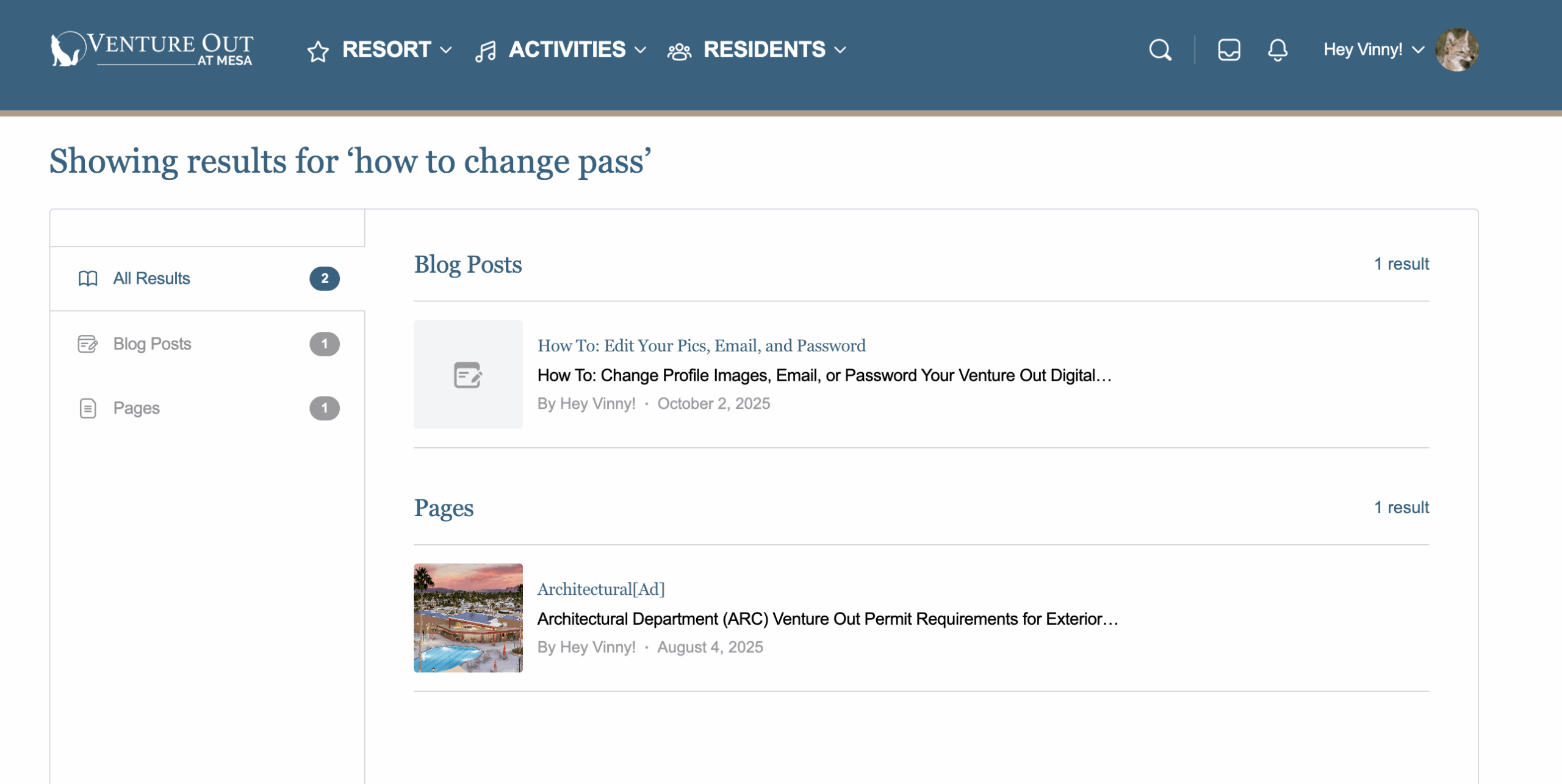 Our new website, ventureoutmesa.com, has a powerful search tool. You can find pages, documents, articles, residents, or even addresses, all in one place!