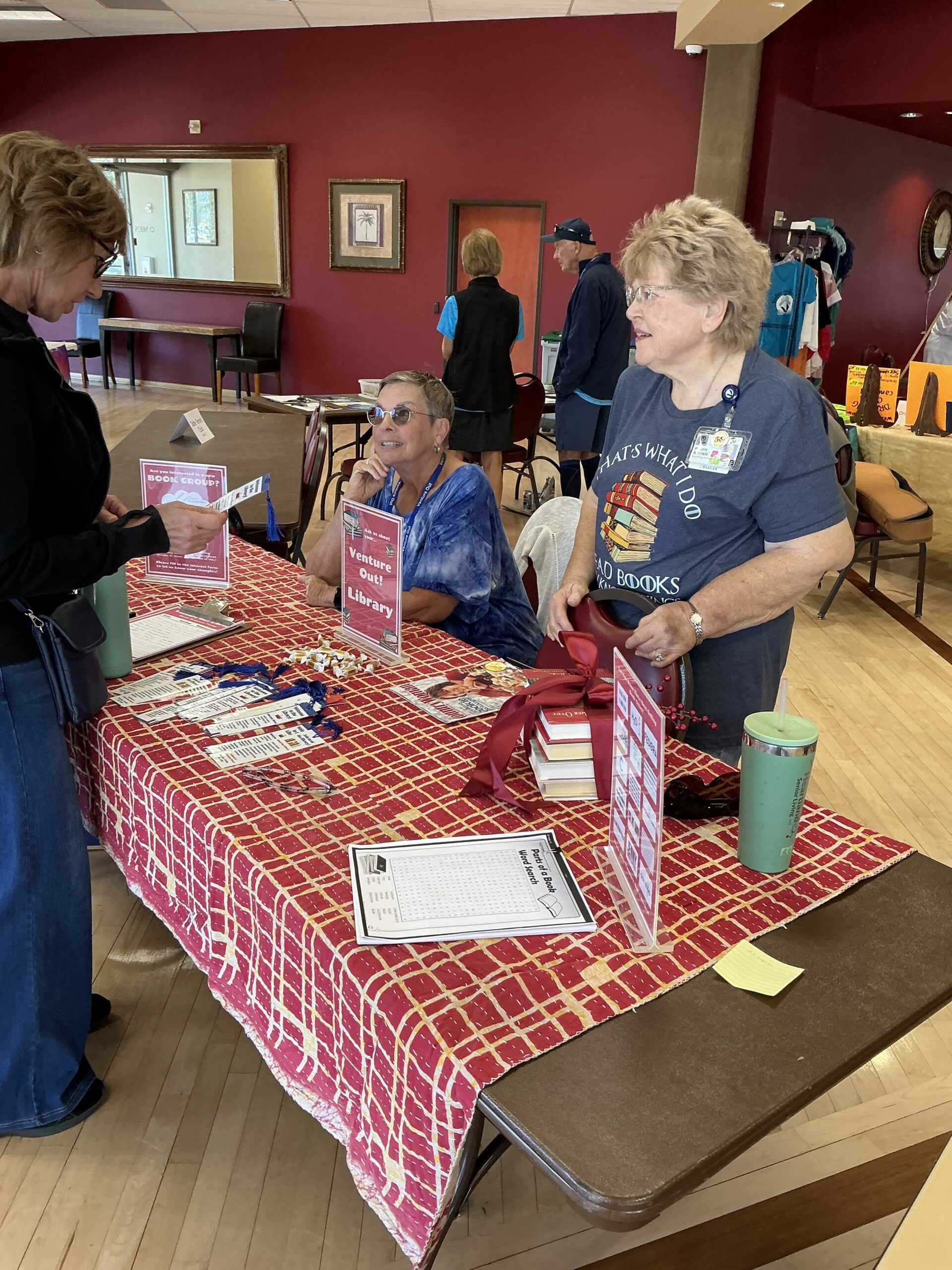 Venture Out has the best, biggest, and most unique library in the valley. It is this way because of the many hours put in by our volunteer librarians. Processing and buying books, scheduling shifts and training new librarians, organizing book sales, shelving books, and accomplishing all the many details that keep the library running smoothly keep the 25+ volunteers busy.
