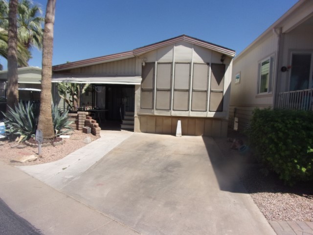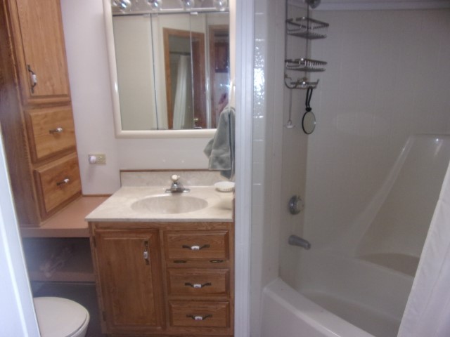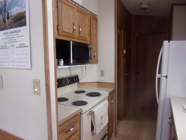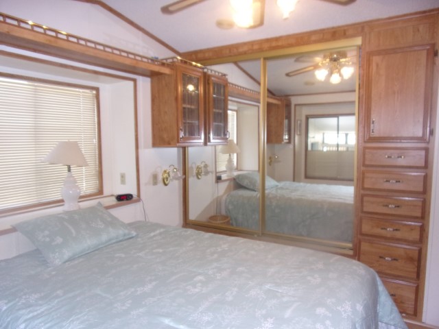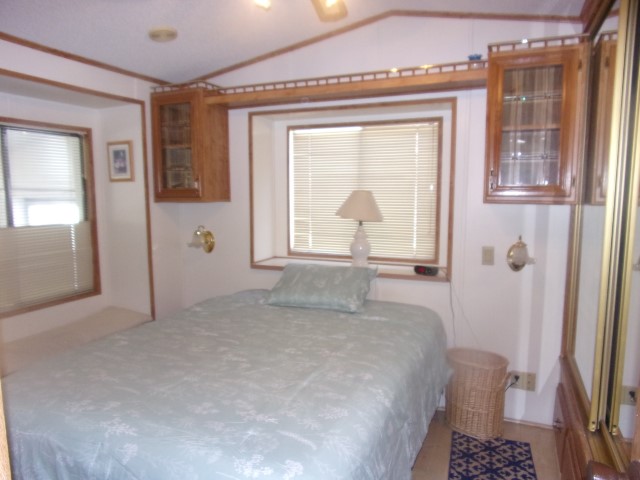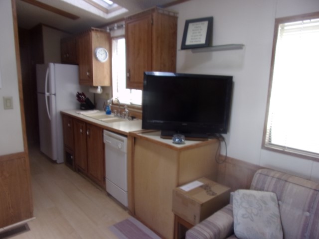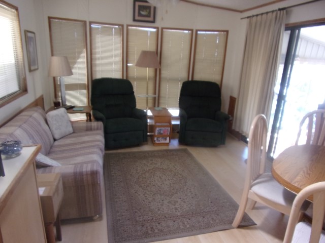 Park Model with living room, dining and kitchen with 2 recliners, sofa sleeper, dining table, flat screen TV, dishwasher, electric stove and microwave. Down the hall is the full bathroom then the bedroom with a Queen bed, built in dresser and mirrored closets. Wood flooring throughout unit.