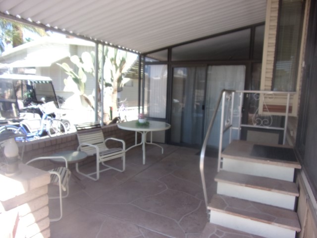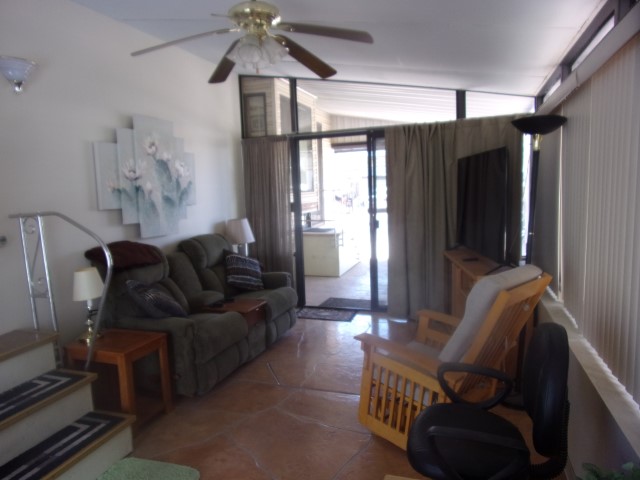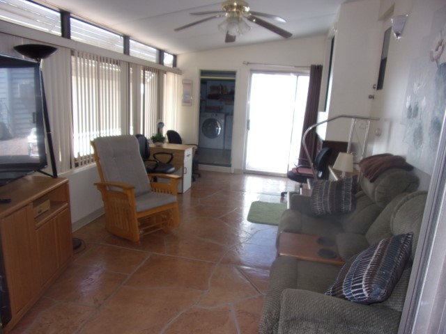 Step down into the AZ room with stamped flagstone flooring, couch with recliner on each end, rocking chair, large flat screen TV and separate laundry room with washer and dryer.