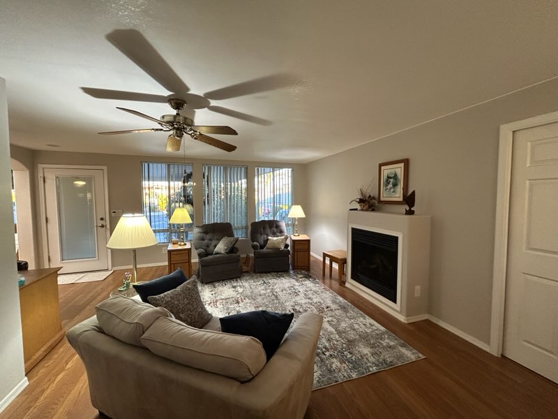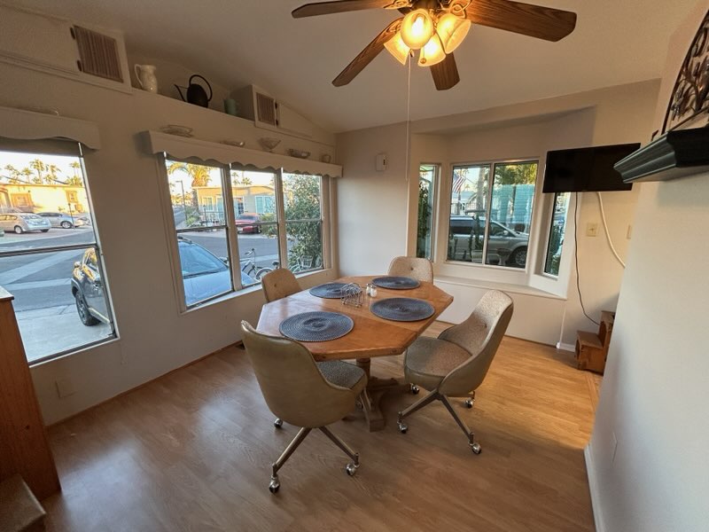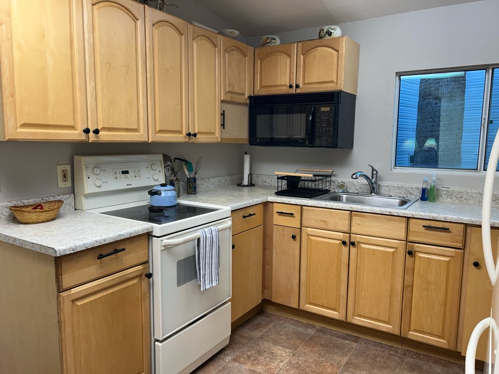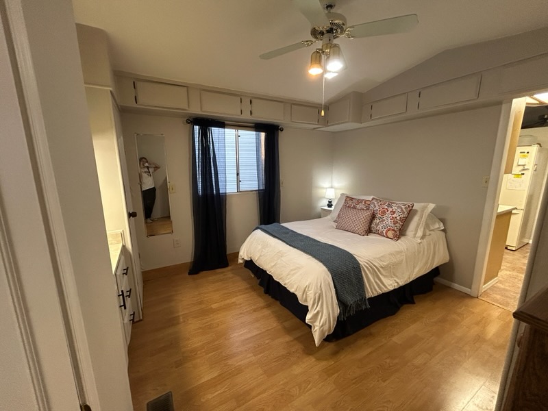 Nice corner lot with covered patio in the front and open backyard with no neighbors behind you. Open AZ Room with wood flooring. Has a big electric fireplace to cuddle up to and relax with a nice book, glass of wine or coffee and a large mounted flat screen TV. There is a room off of AZ Room that could be used for storage or office. Large main bathroom with roomy updated shower/tub and vanity. Also has a washer/dryer conveniently located off of the bedroom. Bedroom has wood flooring, a Queen bed and a vanity with a sink. Kitchen with over the counter microwave and flat top electric stove. Separate dining area with wood flooring. Rent includes water, sewer, trash/recycle, electric up to $100, internet and basic DirecTV. This unit also comes with bikes to get around the park or to use outside the park to go exploring.