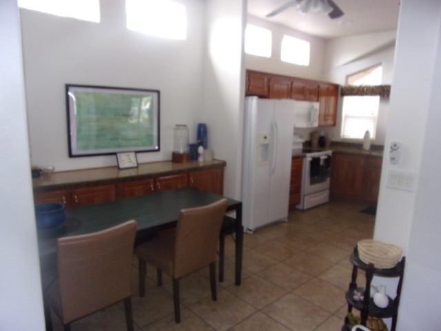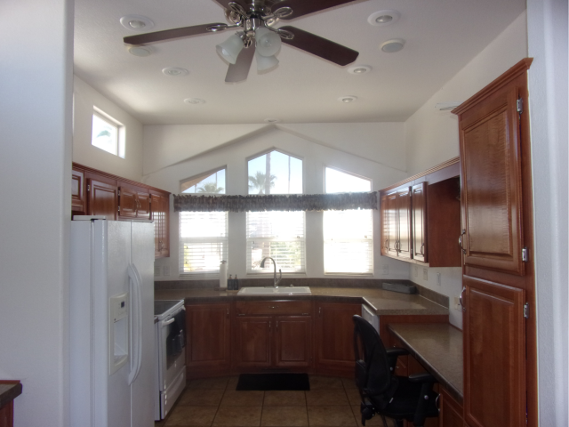 Next is the open dining/kitchen area with vaulted ceilings, dining table/chairs, separate buffet serving counter with cupboards below, kitchen has lots of counterspace and updated cupboards/pantry, built in desk, dishwasher, over the range microwave, flat top stove and new sink.