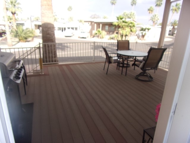Park Model w/Upper AZ Room with an eye catching covered deck to entertain friends/family or sit/relax and enjoy the beautiful weather. Comes with patio furniture and BBQ.