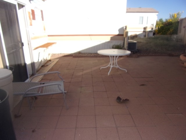 Large paved patio backyard w/flower bed