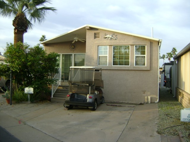 This is a 1985 park model that had been updated when the raised Arizona Room was added. Front kitchen with island. Large dining room. Spacious living room. Good sized bedroom with bathroom. Bathroom has a step in shower. 2nd bathroom is a half bath in Arizona room. Laundry. Ground level workshop/ storage in back of home. Deck in front for entertaining. What you see in the pictures is what you get…
