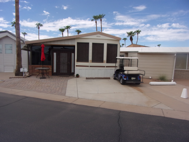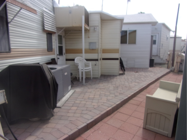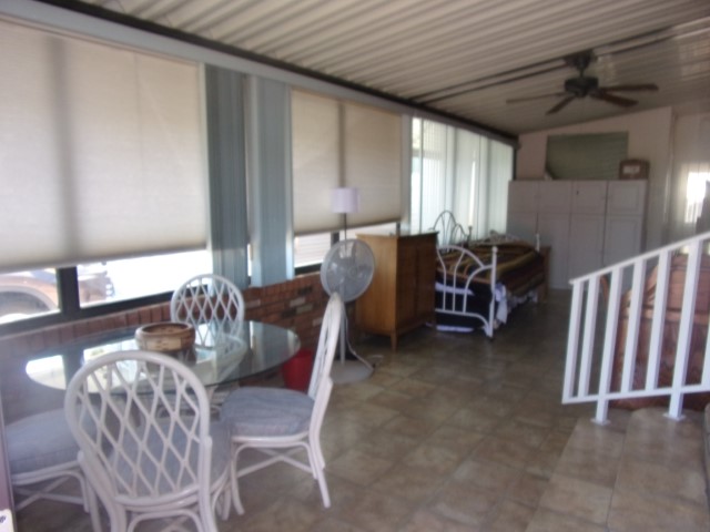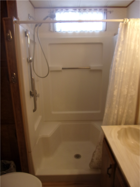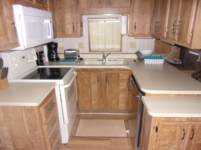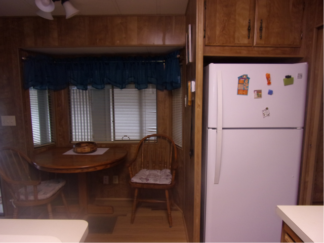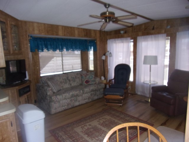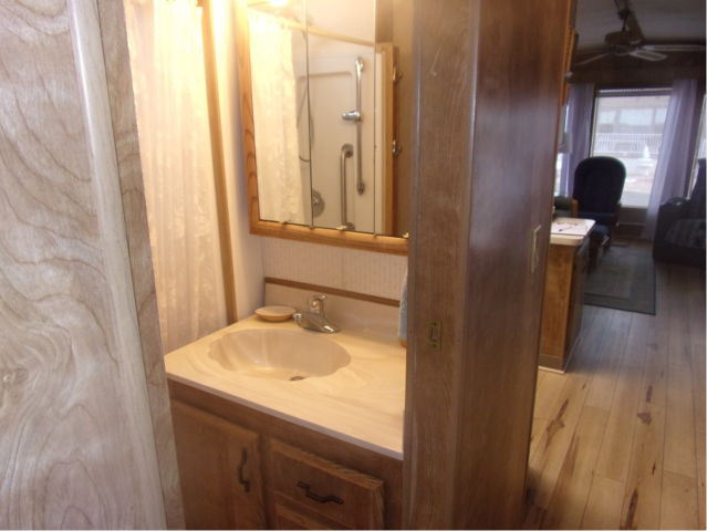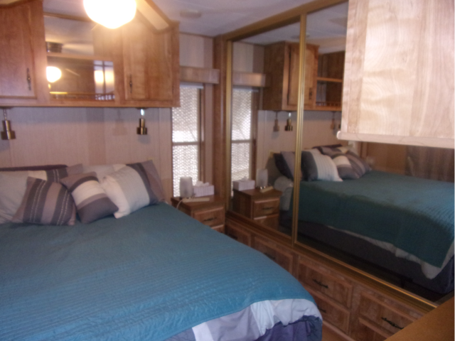 From the AZ room walk up the sturdy staircase into the Park Model living room with flat screen TV, sofa sleeper, rocking chair and recliner. Off the living room in the dining area with dining set that sits 4, kitchen with over range microwave, flat top stove and brand new dishwasher. Go down the hall to the full bathroom with a roomy walk-in shower and then is the bedroom with a Queen bed large mirrored closets with drawers below, cupboards above bed and more cupboards and drawers on the opposite end of the bed (not in photo).