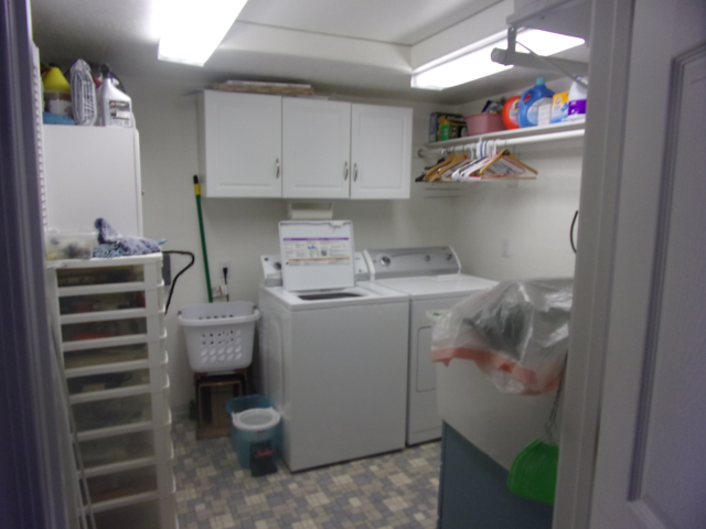 Park Model with lower AZ room with sitting/game table, desk, dresser, Trundle bed and large storage cabinet. Off the AZ room is a separate laundry room with side by side washer/dryer and place to hang clothes to dry.