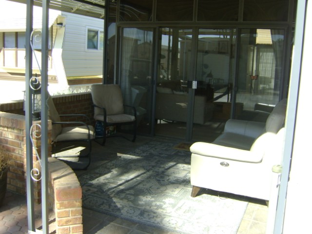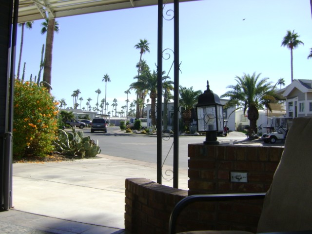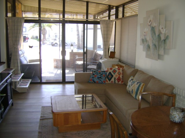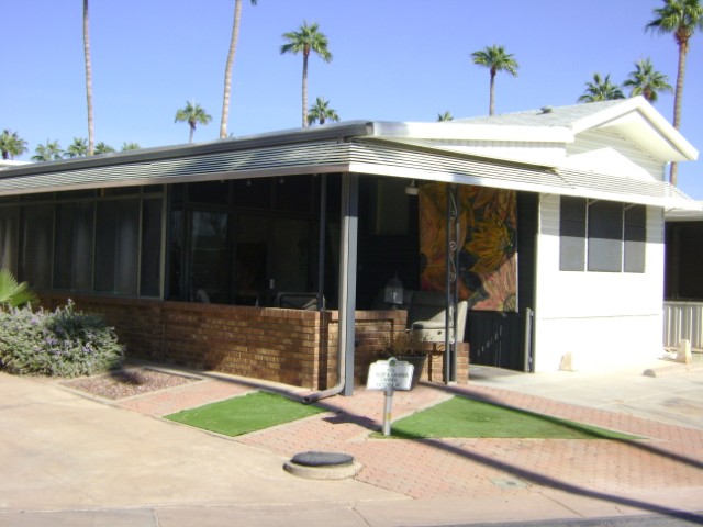 1990 park model w/ AZ Room. 2nd lot in from a corner so there are more open views from the front covered patio. Also this home has a close in location to the rec. center, East pool and fitness center. Nice new flooring all the way around. Fresh paint job. Roomy AZ Room, storage with laundry, office, center kitchen (new stove) and KING bedroom. Furnishings stay. A/C is quite new too!