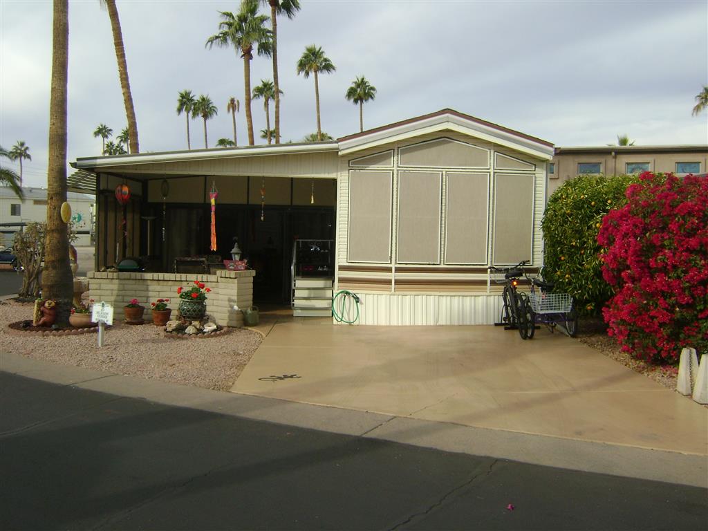 Feels like home when you walk into this 89 home with AZ Room… This is situated on an East Facing corner lot. Fully furnished including 2 newer recliners and a new queen size murphy cabinet bed. Mix of carpet and vinyl flooring. 2 BATHROOMS AND NEW A/C/HEAT UNIT! Laundry stack. Owners closet/ storage room. Nice desert landscaping. Front covered patio.