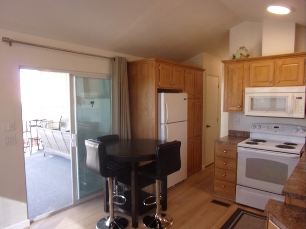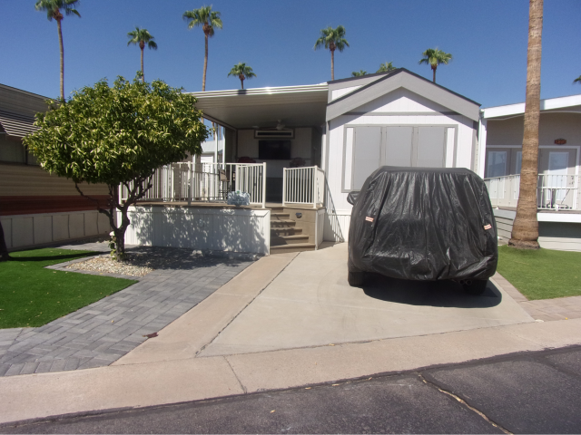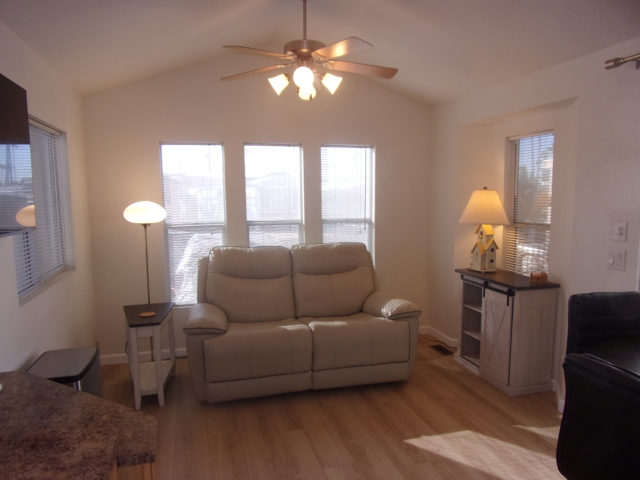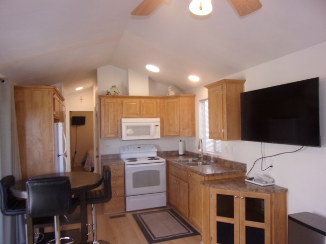 Raised Park Model with spacious covered patio/deck with flat screen TV and mini fridge. Great for entertaining. Has 1.5 Bathrooms, which is a rarety for a Park Model. New flooring. Getting a new fridge and stove.
