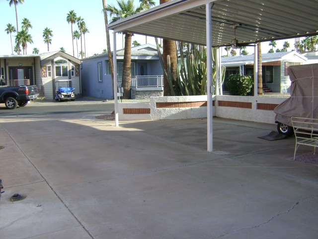 Concrete pad and patio area, has tall awning with ceiling fans. The shed has a FULL kitchen, laundry and storage!!