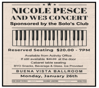 Cost: Reserved Seating $20 – 7 PM Performance in the Buena Vista Ballroom
