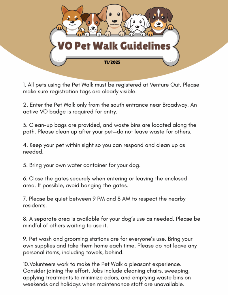 And finally, a Gentle Reminder Pets should not be walked throughout Venture Out with the intention of having them “do their business.” Please take care of that in the Pet Walk or in the privacy of your own yard. If you decide to take your pets for a walk throughout Venture Out, be prepared with water and bags to clean up any accidents promptly.